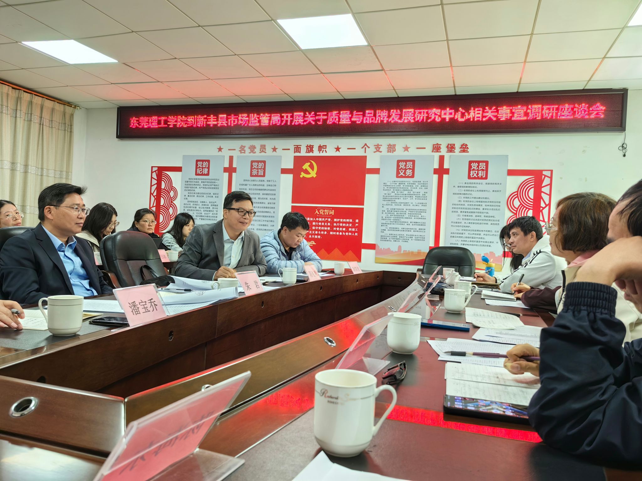 10月23日,服务小分队赴新丰县市场监督管理局调研座谈。座谈会上,新丰县市场监督管理局局长朱君介绍了当地企业发展、质量标准化建设、品牌打造、低空经济产业高质量发展及“新风味”区域品牌推广工作进展。随后,双方围绕“东莞理工学院新丰县质量与品牌发展研究中心”战略合作展开深入交流,重点在党建共建、企业培训、市场培育与品牌建设等方面达成共识。最后,东莞理工学院材料科学与工程学院党委副书记、驻新丰县服务队队长陈礼明补充说明了合作实施路径,强调将依托学校专业优势,推动新丰本地企业与东莞产业链、创新链深度融合,发挥学院的智力优势、人才优势,助力新丰经济高质量发展。
