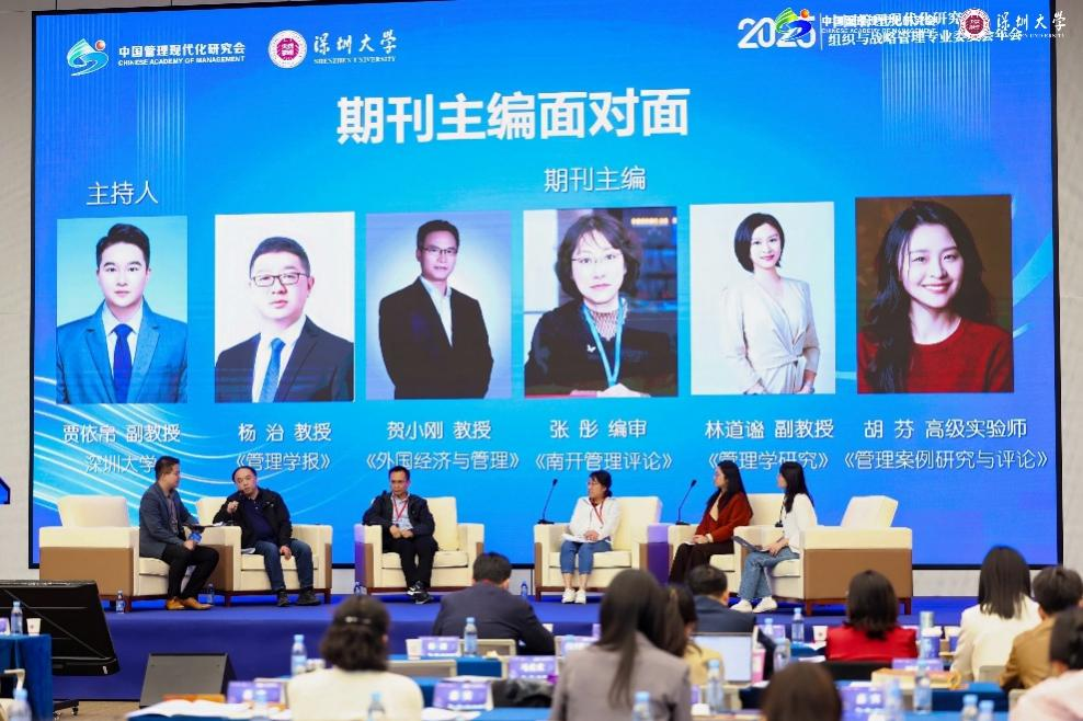 会议于22日上午正式开幕,深圳大学副校长巢乃鹏教授致欢迎辞。随后,西交利物浦大学席酉民教授、浙江大学魏江教授、清华大学罗家德教授等知名学者分别围绕数智化背景下的组织网络化、数字战略架构、领导力与创新绩效等主题发表演讲。在“期刊主编面对面”环节中,《南开管理评论》《管理学报》《外国经济与管理》等高水平管理学期刊主编与编委,围绕“AI在论文写作与期刊投稿中的伦理”这一现实议题展开深入对话,引发了与会者对学术规范与技术创新关系的广泛思考。“靶子论文研讨”环节则聚焦前沿管理学案例与方法创新,南开大学白长虹教授、华中科技大学杨治教授、浙江工商大学陈衍泰教授分别报告了团队最新研究成果,内容涵盖创造型企业案例、高校成果转化冲突机制、人工智能与组织创造力等方向,为大会营造了高水平的学术交流氛围。