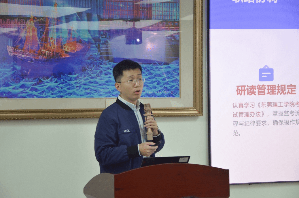 紧接着,金龙老师就期末考试监考工作提出进一步要求。他针对考前设备和环境的准备、考试途中监考相关注意事项以及考试突发情况的应对都做出了详细阐述。其中,他特别交代教师们需明确监考职责、维护良好考试秩序,同时叮嘱学生诚信应考。