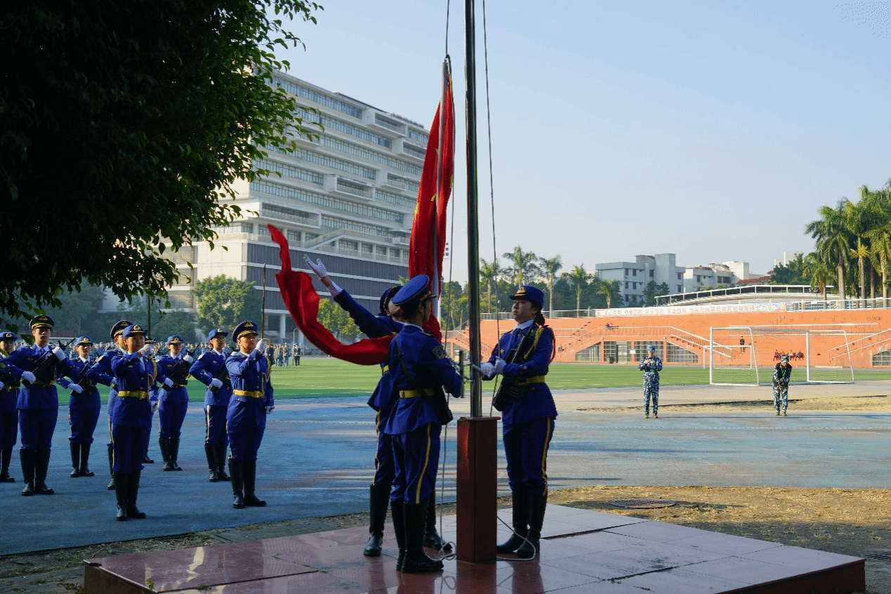 仪式伊始,国旗护卫队护送国旗庄严入场。伴随雄壮的国歌声响起,五星红旗冉冉升起,全体人员肃立高唱,展现出莞工学子昂扬向上的精神风貌。