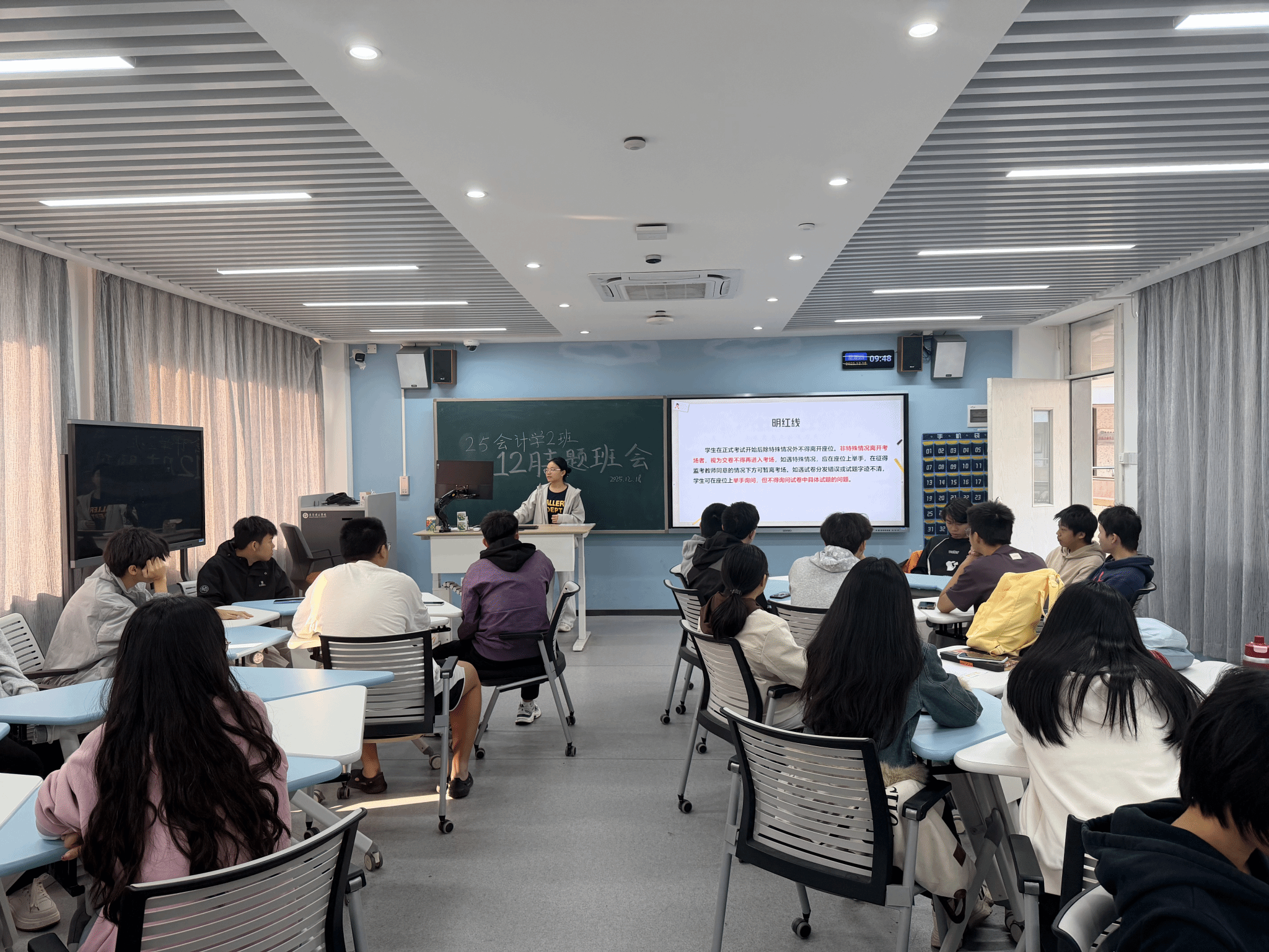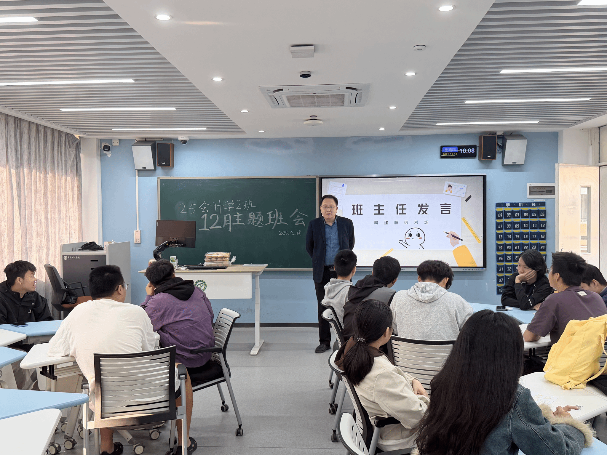 为进一步强化考试纪律、筑牢诚信根基,同时缓解同学们的备考压力,12月18日,经济与管理学院25级会计学2班在3202教室开展“诚信正考风,聚力迎期末”主题班会。本次班会由班长钟欣秀主持,班主任方东霖老师及全班42名同学共同参与。