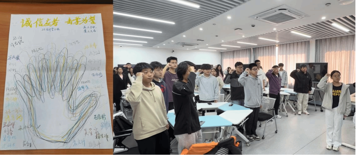 诚信承诺环节中,全体同学起立宣誓,以铿锵誓言表达拒绝作弊、坚守底线的决心。接着,同学们依次在诚信应考誓言书上签字“画押”,以具象化的仪式将口头承诺转化为郑重行动,强化了承诺的严肃性与约束力,进一步筑牢诚信应考的思想根基。