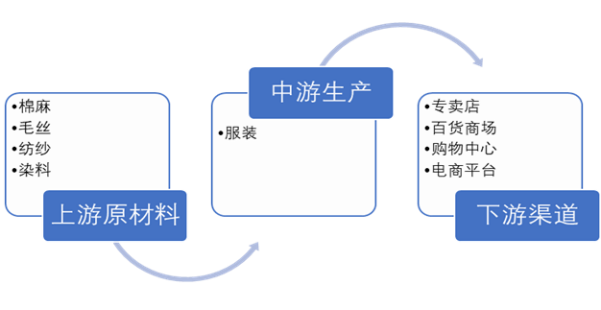 如今,服装又可以进一步分成很多品类,各种服装形态、服装的用途、服装制作方法等等都存在区别。把整个服装行业划分为一个链条来看,最开始是上游原材料的供给环节,接着就是中游成衣制造环节,最后就是下游各渠道销售环节等,如下图1所示。作为我国的重要经济形式之一,国家和相关部门也对服装行业提出了相应的发展愿景,比如,中国服装协会曾经就提出建立现代服装产业文化体系,倡导品牌专业化、精细化发展提升自主品牌竞争力等等。