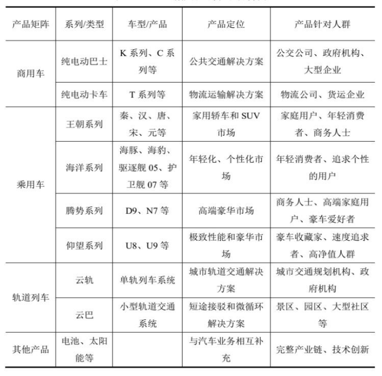 乘用车:王朝系列(汉、唐、秦)、海洋系列(海豚、海豹)、腾势及仰望高端品牌,形成从经济型到豪华市场的全覆盖。
