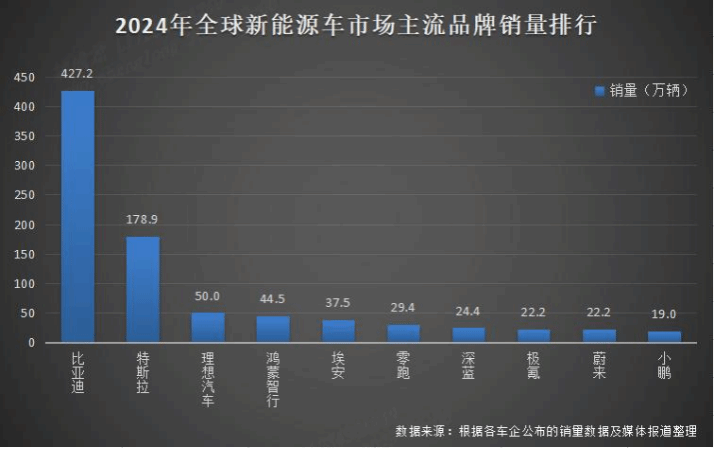 图 4 2024年全球新能源车市场主流品牌销量(万辆)